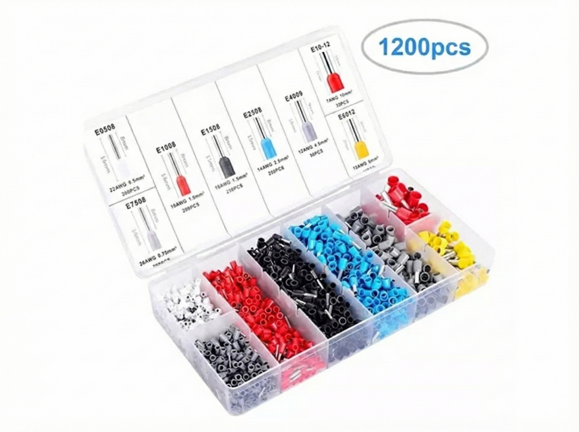 El set incluye 1200 terminales aislados en distintos tamaños, ideales para proyectos eléctricos en el hogar, automóviles, electrónica industrial, baterías, interruptores y componentes electrónicos con pines.