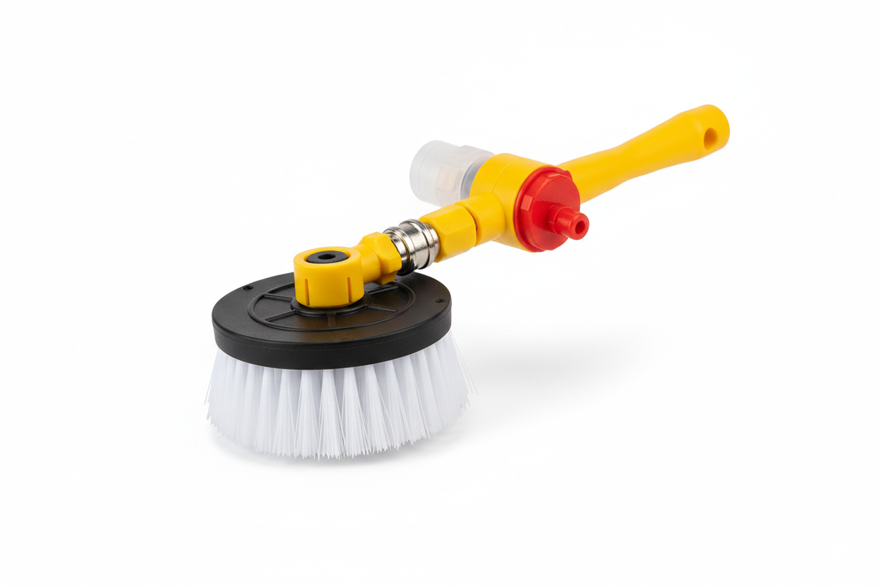 Cuenta con cerdas suaves pero resistentes que limpian sin rayar, ideal para autos, llantas, pisos, terrazas, paredes, ventanas y superficies exteriores. Fácil de instalar, liviano y práctico, compatible con mangueras estándar, perfecto para uso doméstico y exterior.